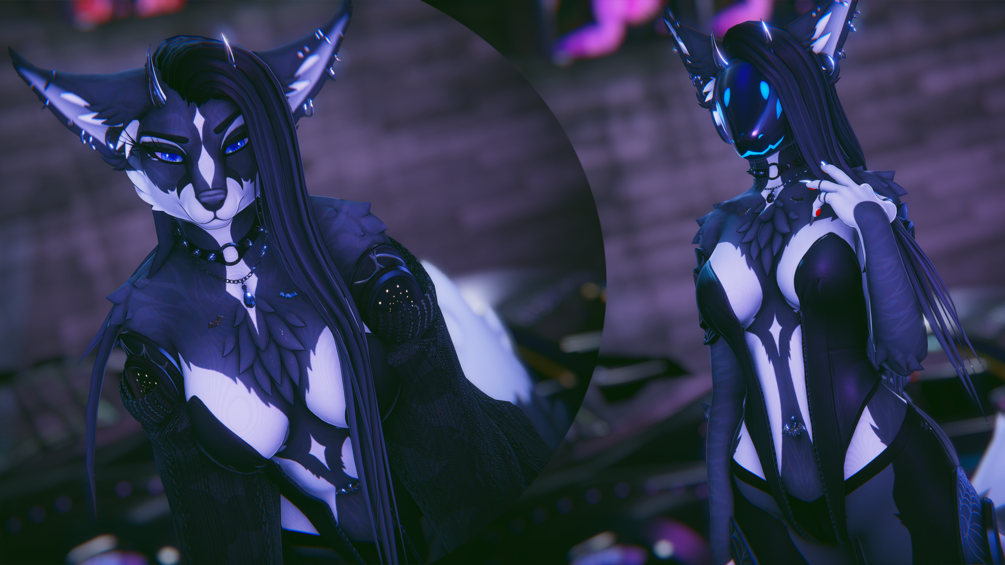 For face tracking to fit on the avatar I removed some smaller toggles such as ear tufts etc. These can still be adjusted in unity with a blendshape ^^ Facetracking versions have hue shifts!! The protogen follower and plushie did not fit with FT but they will be available server side for your adding preferences!